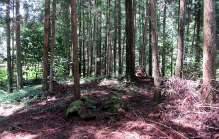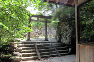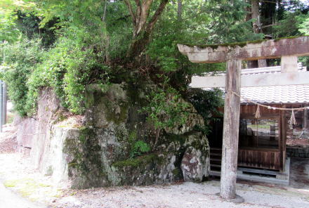 ということで、八剱神社には――諏訪社や住吉社のように――総本社を頂点とする階層序列はないのですが、しいて共通点をあげれば、「国づくり」の物語で画期をなすような活躍をした神々を祀っているということです。 ■岩棚の上には神社と樹林■ さて、神社が祀られた岩棚はミニテュアの山城みたいな形です。鳥居の脇には石垣防壁のような岩が張り出していて、社殿の背後は小高い小丘となっています。そこは杉が密生する樹林で、神社の背後を守る社叢となっています。