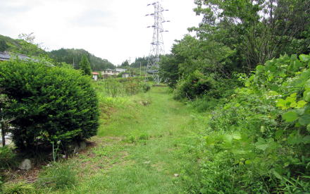 さて樹林を抜けると、一気に視界は開けて、田園風景を眺められる見通しのきく谷間の景観となります。ここは上の原と呼ばれる地区への入り口です。大きな送電鉄塔を目標に、北東方向に畑と谷沿いの樹林帯との境界を往く草道を歩きます。