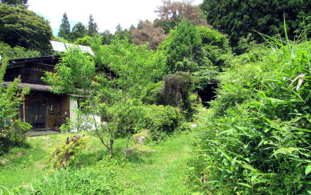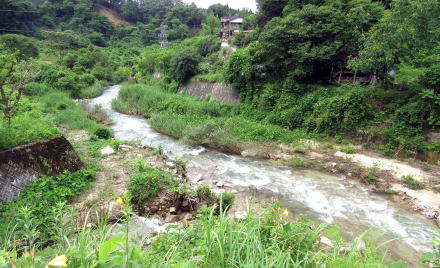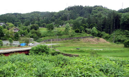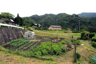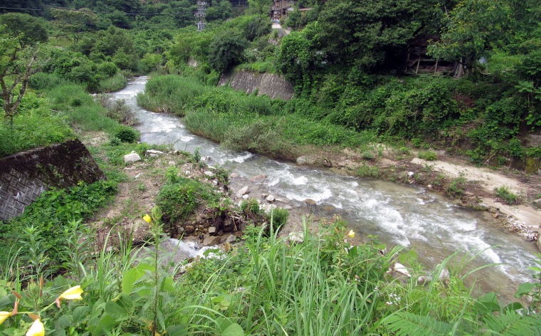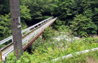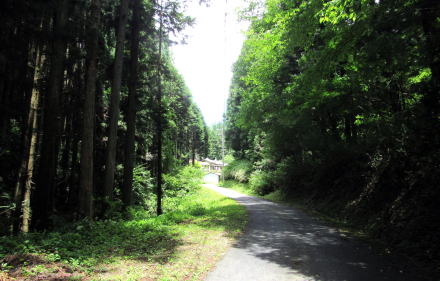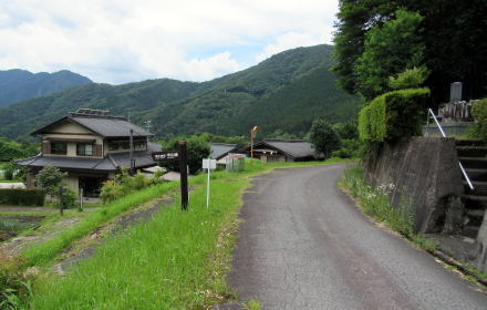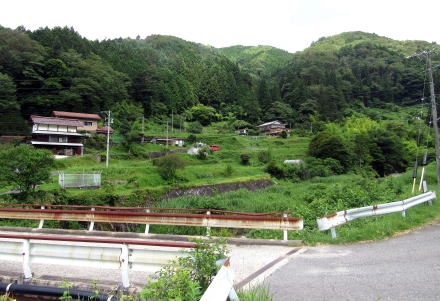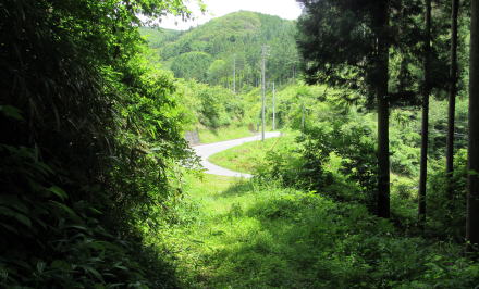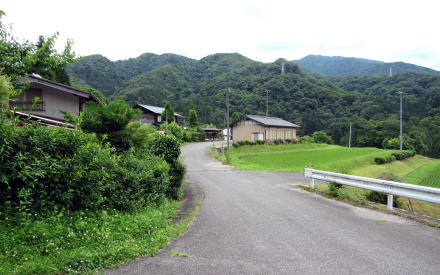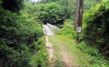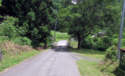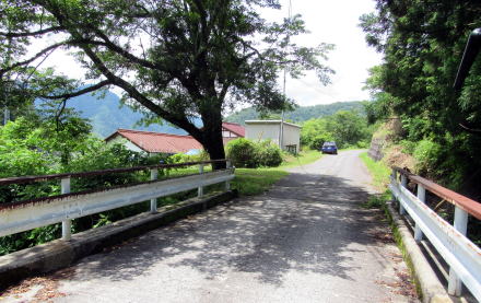 上の写真の中央は、高曽根山の尾根の鞍部を越えて小野川平に出てきた街道跡です。しかし現在は、土砂崩れがあって通行止めになっていたので、道筋をたどることができませんでした。 ■坂本平から須合平をめざす■ さて、私は小野川平の集落を抜けて与川に架かる橋を渡りました。与川右岸の丘は坂本平と呼ばれる地区です。ここからは、与川の本流の谷間を遡る旅となります。