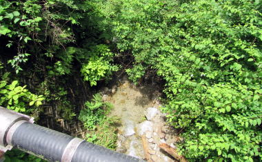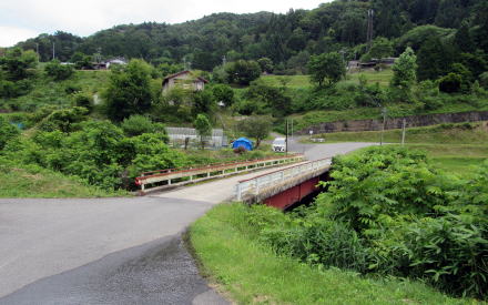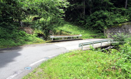 緩やかな上り坂の舗装道路を進んで正善沢の谷間を越えると、ふたたび沢が刻んだ谷間に入り道は大きく曲がり、両側に低い欄干が付いた小さな橋を渡ります。与川と落ち合う前に正善沢と合流する沢ですが、名称はわかりません。