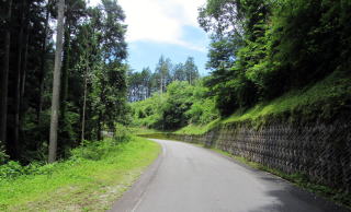 舗装道路に出てみると、この舗装道路は2つの向かい合った尾根の間の谷間の片側を切通して開削建設したものであることがわかりました。稜線から幾筋もの沢や湧き水が流れ落ちてくるので、擁壁の土砂崩れを防ぐためにコンクリート石垣を施して補強してあります。 ■下山沢の谷を抜けて小野川平へ■ さて、この先舗装道路は下山沢の谷間に向かいますが、道筋は沢の谷間を東に大きく迂回して橋を渡ってから北西に転じ、与川の本流にいたります。ところが、往古にはこの舗装道路とほぼ同じ道筋のほかに、下山沢の南から迂回しないで、そのまま北東方向に進んで谷に降りて沢を渡り、谷底から北西方向に進路を取って集落に入る経路があったものと見られます。