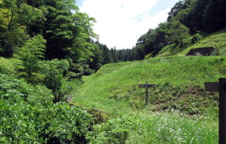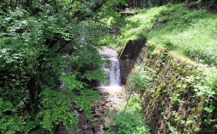 下山沢の流水量が大きいことから、ここで沢を渡らずに、舗装道路とほぼ同じ経路で下山沢の谷間を回り込んで超える脇道があったとしても当然です。もっと上流で沢幅の狭いところに橋を架けて渡り、高曽根山(標高1119m)の尾根の東端の鞍部を横切って与川の谷間に進む経路があったようです。私が地形から探ってみたところ、旧道は北東方向に進んで尾根山腹をのぼり、尾根の鞍部で方向を北に転じて谷を降り、小野川平の集落に入ることができます。