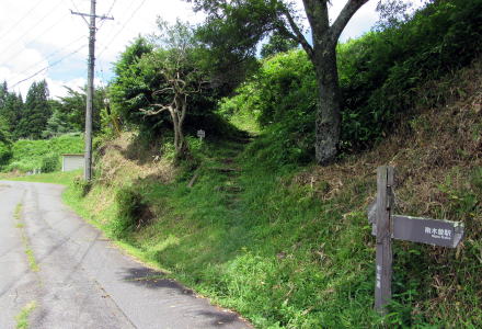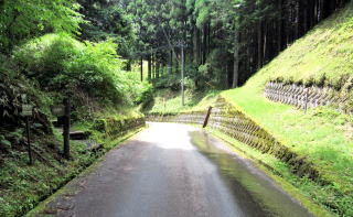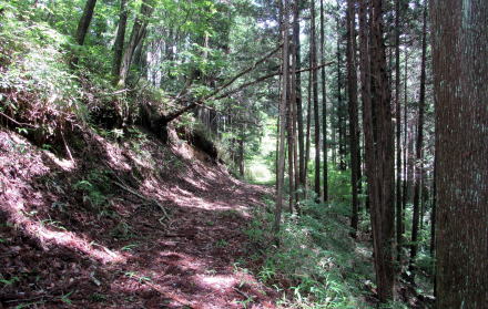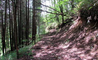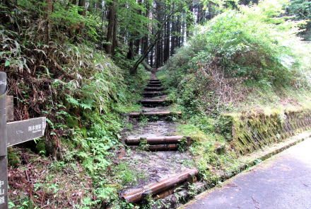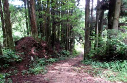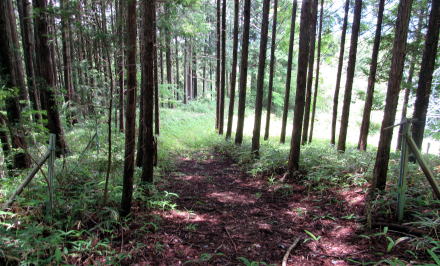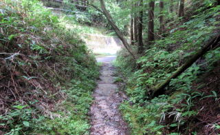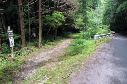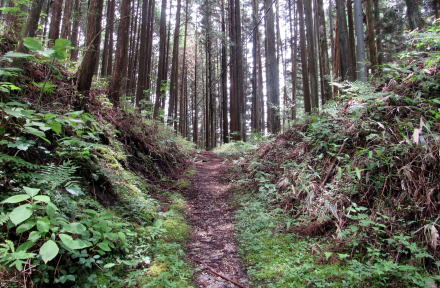 この細道は、雑木林のなかをほぼ北向きに抜けて針葉樹林のなかに入っていきます。そのまま進むと、樹林を突っ切ってふたたび舗装道路に合流します。この辺の土壌は水はけが悪いので、この古道を歩くときには、登山靴など水濡れに堪えられる支度をしてきてください。