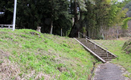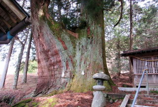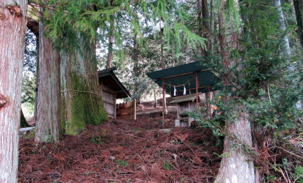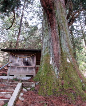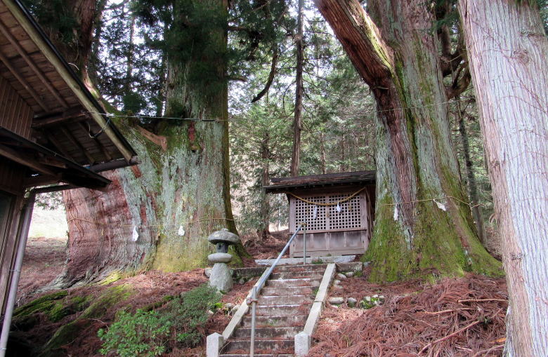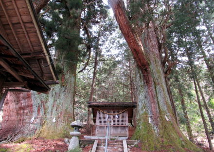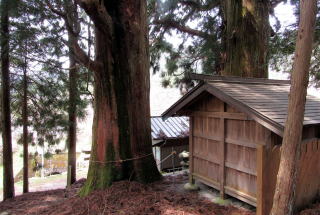![]() 石段の両脇に立つ2本の杉の巨樹の奥に控える神明宮の社殿 |