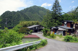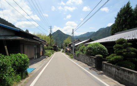 田畑が山麓斜面に拓かれていて、ところどころにある平坦地が狭いので、せいぜい数軒の家屋の集まりが小径沿いに分散しています。中山道はそういう分散的な集落のなかを通っています。
