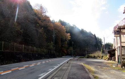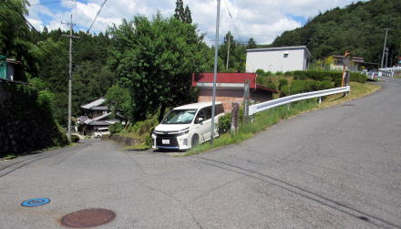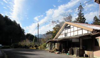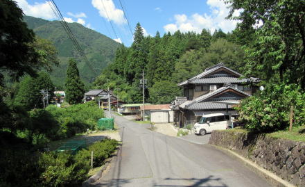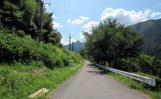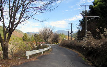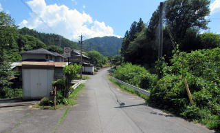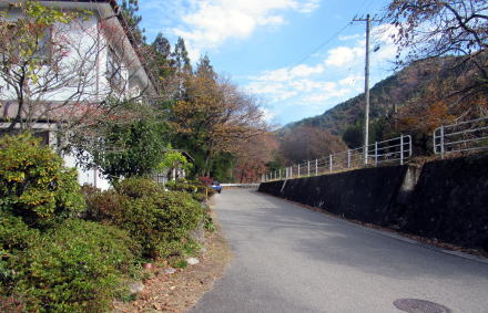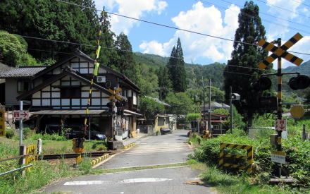 上在は、そういうふうに古い歴史をもつ村落ですが、現在は過疎化がかなり進んで、街道沿いの家並みはまれです。 ■上在から関山へ■ さて、数軒の家並みを過ぎたところでふたたびJR線路を渡って、南側の尾根裾を往く道を進むことになります。
