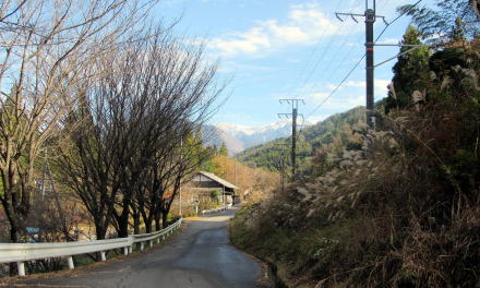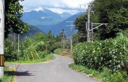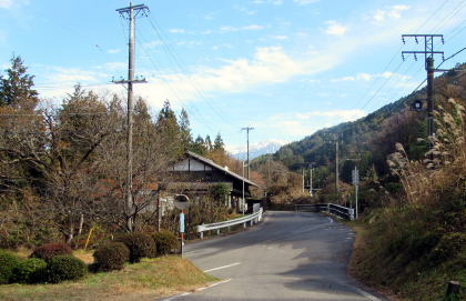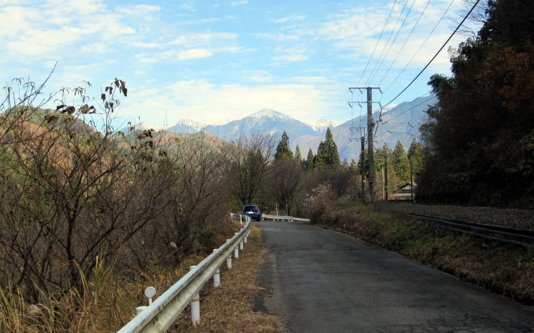![]() 写真の中央奥に見えるアルプス木曾駒ケ岳を望みながら、上在集落に下っていく長い坂道。左の崖下に木曾川が流れる。 |