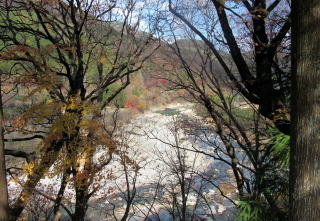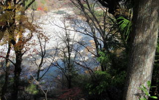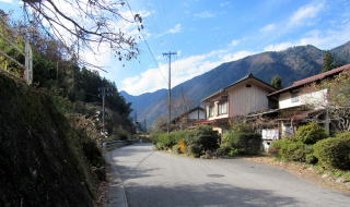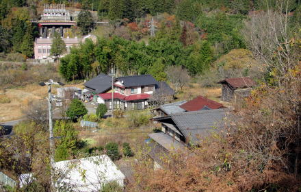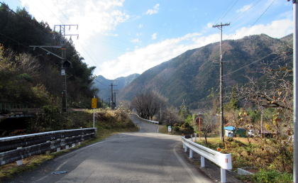 JRの線路の北側に渡ると、しばらく平坦な道が続きますが、まもなくふたたび木曾川河畔まで下っていく坂道となります。この坂の下に上在の集落があります。いまは、発電所施設の真向かい、一番下の河岸に民家が集まっていますが、これは木曾川上流にダムがいくつか建設されて、水害に対する安全性が高まった昭和期中期以降につくられた住宅地ではないでしょうか。