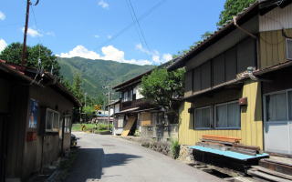 木曽殿関所跡は、国道19号の北脇にあります。ここにはかつて鉄筋コンクリート造りのホテルと本棟造りの木工店があったようですが、どちらも今は住人がいないようで、荒廃し始めています。廃墟になりかけています。 |