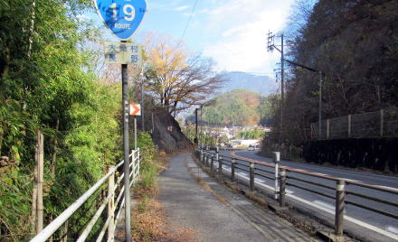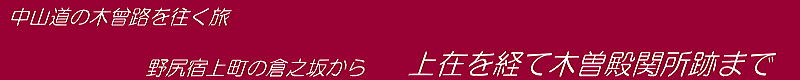 今回は上町の高札場跡から歩き始めて、倉之坂を下って上在集落を経由し、そこから国道19号に合流して関山まで歩きます。関山は、旧野尻村と長野村を隔てる大きな尾根のことで、南から北に張り出しています。 その木曾川縁の突端に、平安時代末期、木曾義仲が関所(関門)を設けたと伝えられています。上町高札場跡から関所跡までは、およそ2キロメートルの道のりです。 ◆倉之坂から上在を経て関山まで◆ |