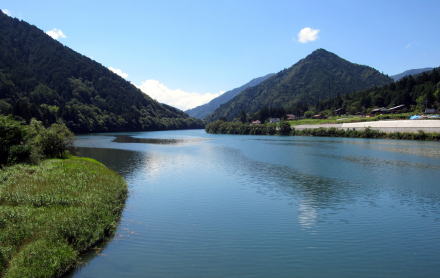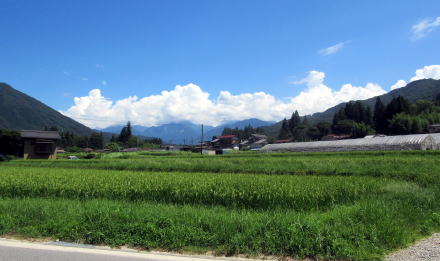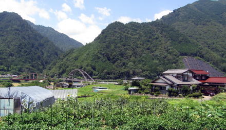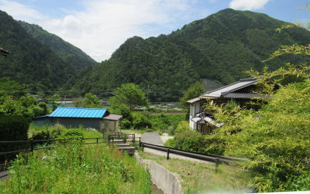 耕作地はというと、城山の山裾から木曾川へと続く斜面には段々畑や棚田が連なっています。斜面の傾斜がきついので、田畑の形は等高線に沿って細長い帯状になっています。