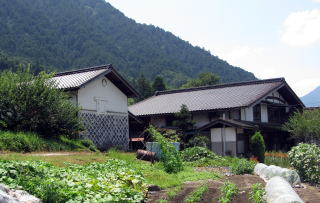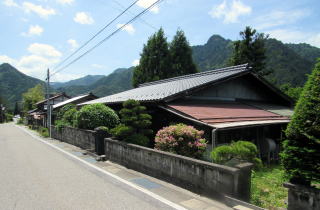 とはいえ、城山から木曾川に下っていく城山尾根斜面の段丘上に造成された敷地なので、奥行きは浅いので、家屋と道路との間に広い前庭はありません。概して木曾谷の集落は狭い谷間にあって平坦地がわずかなので、各住戸の庭の面積がきわめて小さいか、あるいは庭がほとんどないという特徴がきわだっています。ただでさえ限られた敷地を庭に回すことができないということなのでしょう。