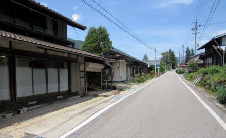 現在の県道261号沿いにつくられた家並みは、野尻宿のような宿駅の都市的な――密集した家並みの――集落ではなく、下在郷という郊外農村部の家並みとなっています。したがって、各住戸の敷地の形つまり敷地割は、宿場のなかのように稠密ではありません。