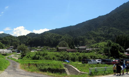 田畑が山麓斜面に拓かれていて、ところどころにある平坦地が狭いので、せいぜい数軒の家屋の集まりが小径沿いに分散しています。中山道はそういう分散的な集落のなかを通っています。