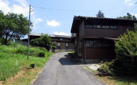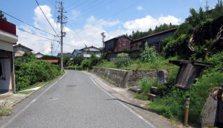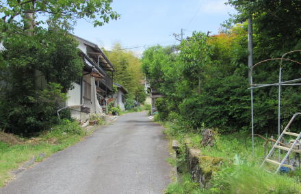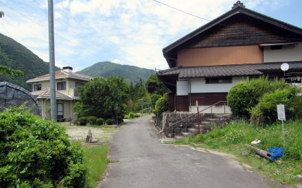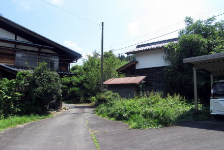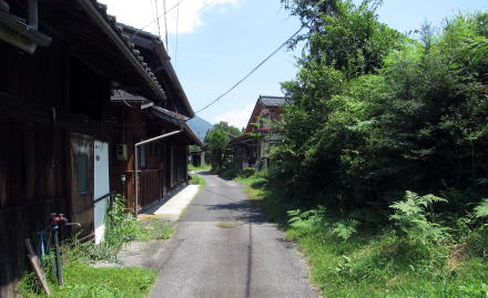 ■下在郷の集落を歩く■下在郷は、野尻城山の北麓で木曾川に下る斜面にあって、河岸段丘が幾重にも連なっています。一番上野段丘を国道19号が通り、その下の段丘を旧中山道が鉄道と隣り合いながら通っています。そこから木曾川の畔までは、さらに何段かの段丘斜面が続いています。 野尻宿に向かうためには、そんな旧街道を北東向きに進むことになります。街道沿いのところどころに数戸の家屋が集まっています。