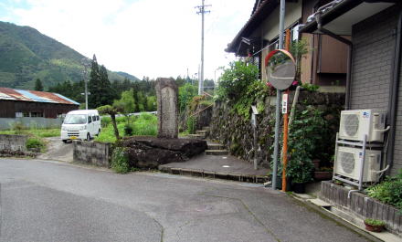 そこから100メートルほど北東に進むと、江戸時代に「東のはずれ」という屋号で呼ばれた町家の跡があります。ここが野尻宿の東端で、その先に高札場跡とイボ石があり、斜面の上の高台には米殻蔵があったそうです。