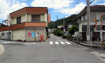 歩き始めて20メートルほどで「やまます趣味の店」というディスプレイが残る釣具店跡の前に来ると、道は大きく曲がります。一軒おいた隣は警察官駐在所で、その前(街道脇)の大石の上に木製の小さな祠が――何やら意味ありげに――祀られています。この辺りを含めて庭田屋から東が旧本町ではないでしょうか。