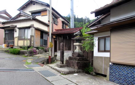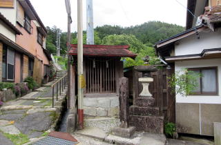 上町の坂道の坂道の曲がり角の脇に小さな堂舎があります。それは上町の秋葉社や八坂社、不動尊を合祀した社で、ここが明覚寺への参道となっています。