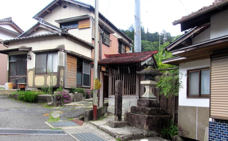![]() 上町の中ほどの曲りに置かれた小さな祠堂。ここから妙覚寺への石段参道が始まる。 |