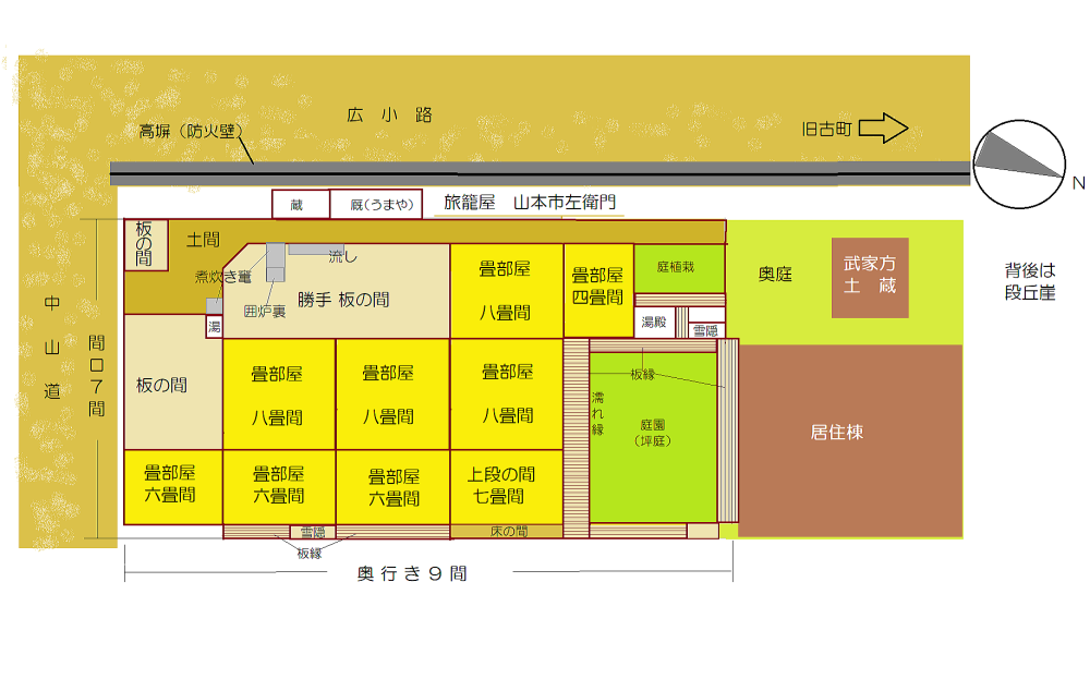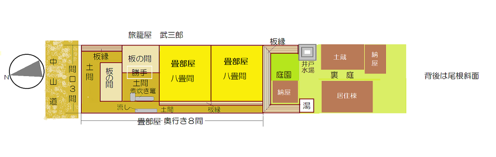 おそらく参覲旅をする藩の多くが須原宿に投宿・宿泊したためだと見られます。藩主に随行する従者家臣団の数も多かったので、宿場街としてはそれだけ旅籠の収容力を大きくする必要があったのです。 ◆須原宿の旅籠 屋内のつくり(間取り)◆ |