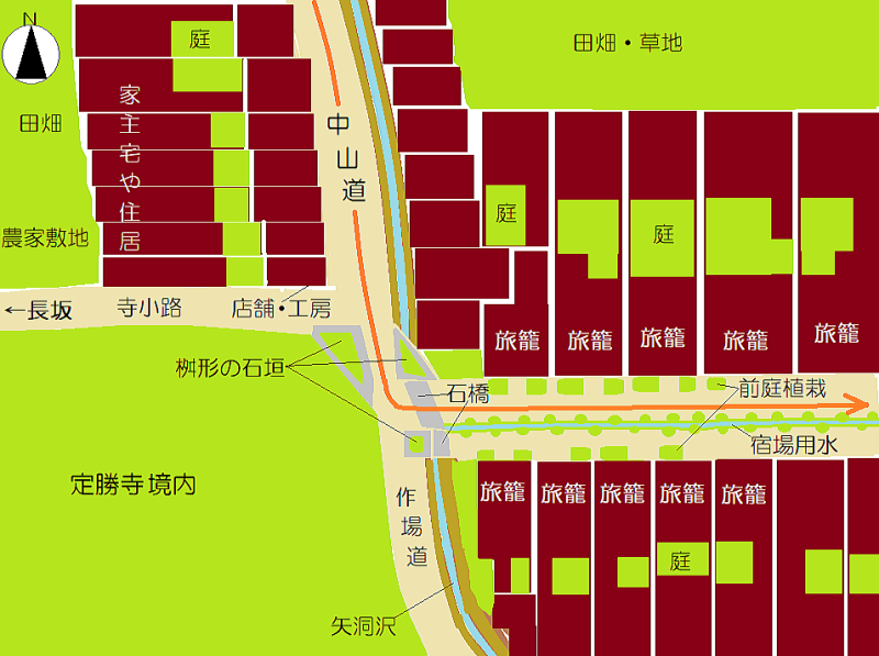 前庭の植栽: 幕府の道中奉行は、街道と宿場の景観を美化するために、各戸の街道に面した側に前庭植栽を施すように指示していました。前庭の幅は、宿場の道幅によって、3尺ないし1~2間ほどでした。 もちろん、宿場が山間にあるため地形が険しくて宿場内の街道の幅が狭くなり、前庭を造ることができない場合には、この限りではありません。 こうして、江戸時代の街道や宿場には、旅人や住民の心を癒す美しい景観が提供されました。 作場道: 作場とは田畑などの耕作地のことです。作場道とは、宿場の農民が仕事場としての田畑に向かう小径のことです。幕府の高官や参覲旅の大名家が宿駅に停泊しているさいに、街道を通行できないので、住民が通る裏道・脇道としても利用されました。 現在は県道265号が、定勝寺境内の北端の石垣下から宿場にまっすぐに通じています。しかし、江戸時代には寺の境内はもっと北に張り出していて、その下を寺小路と呼ばれた小径が通っていて、筋違いで宿場の街道に接続していました。 しかも、中山道から宿場への入り口には両側に桝形の石垣が置かれていて、道幅が狭まっていました。ところが、明治政府の街道令にしたがって、桝形は撤去され、寺の境内が削られて、馬車や荷車などの車両の通行を円滑にする道筋や路面になりました。 |