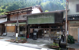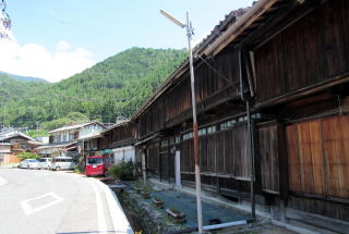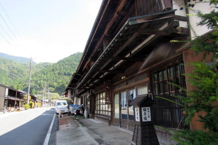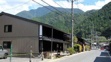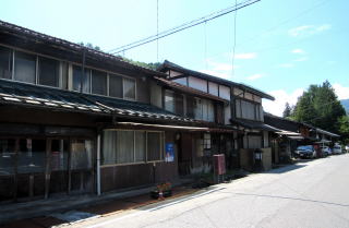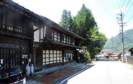 上の写真は幕末からの仲町の町家で、須原宿で最も標準的で一般的であった間口の町家を表しています。間口は3間(5.4m)です。本陣の間口が10間(18.2m)で、脇本陣が9間半(17.3m)、そのほか有力な旅籠や店舗などは間口7間(12.6m)ないし8間(14.4m)でした。一方、奥行きは家屋の背後の地形によって違っていて、本陣や脇本陣、旅籠などは20間~25間、つまり40メートル近くかそれ以上もあります。