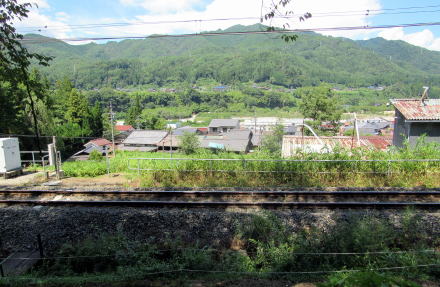 定勝寺境内の東脇を流れる矢洞沢に沿って急斜面の小径をのぼると、寺の裏手(南側)を回り込む林道とのT字路に行き当たります。そこは須原宿の街並みの背後に迫る山腹高台で、T字路の背後の段丘上(南側)をJRの鉄路が通っています。 |