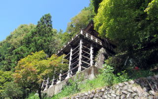 ▲岩壁の前に張り出した懸け造り櫓台の上にお堂が設えられている