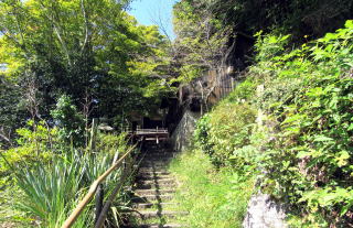 崖縁をのぼる狭い石段参道
