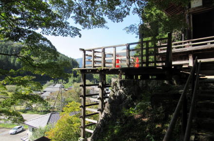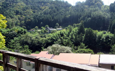 ▲お堂前の舞台から伊奈川対岸の集落を眺める