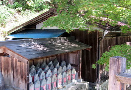 境内参道脇には30基ほども馬頭観音像が集められて祀られています。これは、旧街道の拡幅工事や耕地整理などのさいに撤去した石仏をここに集めて置いたものと見られます。すでに述べたように、旧街道には1丁ごとに石仏が置かれていました。したがって残念ながら、今日の中山道遺構の道脇には馬頭観音などの石仏を見ることができません。