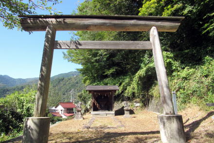 やや破格の神明式(伊勢社に模した)木製の鳥居があり、その奥に小さな社殿(蓋殿)が置かれ、なかに本殿と思しき古い祠(神殿)が祀られています。しかし社号はわかりません。