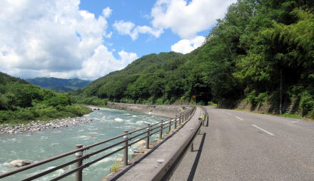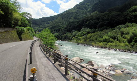 ▲左岸の旧国道19号で下流(斧淵・上松宿)方面を眺める。