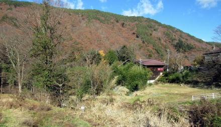 ◆鳥居前に桝形跡があったという◆ 旧街道南側の無佐沢川河畔に石仏群がありますが、その辺りから段丘上の氾濫原が原野八幡宮の辺りまで続いています。そして、鳥居の南東側には土塁のような小丘があります。