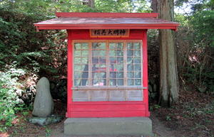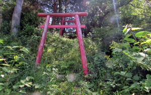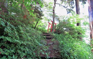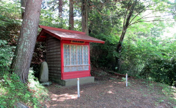 ▲藪原神社北側の切通し崖上にある稲荷大明神の祠 社殿が真赤に塗られている。