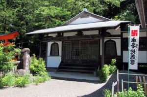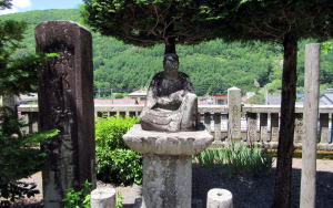 南北に細長い境内の西寄りには石碑や多くの地蔵像が並んでいます。なかでも持ち上げ台座の上にある子安地蔵は変わっていて、片膝を立てた輪王座姿勢ですが、片手は台座に置かずに両手で乳幼児を抱いています。力強いお爺さんが孫を抱くように、幼児を慈しむ姿が印象的です。