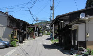 「おぎのや」を過ぎて町の北端近くに藪原宿本陣跡があります。今では白い木製の標柱が立っているだけです。通常の宿場であれば、本陣は町の中心部に置かれていたので、その周囲には主だった商家や有力住民の家屋が集まっているのですが、ここは場末という感じです。