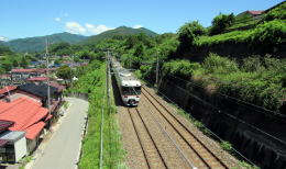 ▲北の眺め。JR中央線鳥居トンネルから出てきた列車。峠の反対側は奈良井駅。