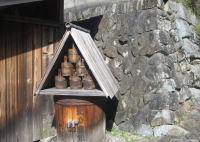 県道を渡ると、すぐ右手に五平餅を売る店舗があって、客が並んでいます。道の反対側には、昔風の天水桶(防火用水)が置かれています【写真下】。