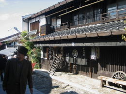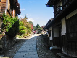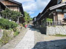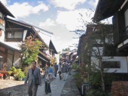 美濃から木曾への入口にある馬籠宿では、街道は北東にひたすら登る坂道です。そこで、家々の屋根がつくる形も北東に向かって階段状に上昇する姿になります。