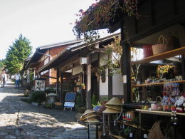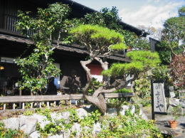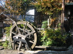 街道に面した家並みはところどころで途切れ、そこでは庭園の奥に店舗などの家屋が位置しています。あるいは店舗の前に植栽やテラス、水車などがあって、それが、ゆったりとした開放感を与えるようです。