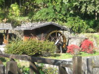展望台から山道を5分も歩くか歩かないうちに、道は下りとなって県道の横に出ます。そこで沢の脇にある水車小屋に出会います。公園風の広場になっています。