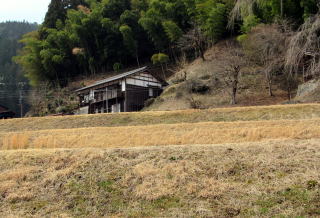 さて、この集落は、山の峰の下に広がる段丘上の斜面にあります。したがって、旅籠集落から段丘までのぼる道は急坂なのですが、段丘上は比較的に緩やかな斜面です。そのため、江戸時代でも下の集落に較べると棚田の開墾がずっと容易であったと見られます。降水量も信州では多い方なので、灌漑用水も山頂下からの湧き水でまかなえたようです。