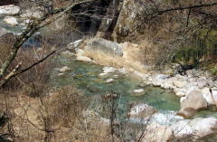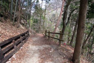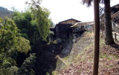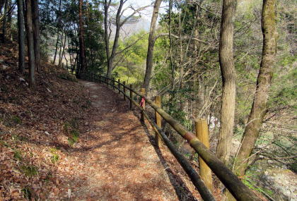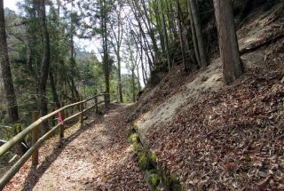 神明の家並みを過ぎると、古街道は竹林を少し下ったのち、崖のように切り立った尾根斜面を回り込んで蘭川の左岸に出ます、そこから杣道は下り坂になり、大妻橋まで続きます。