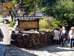ここで道は2つに分かれます。左に行く狭い道は昔の木曾街道で、少し下り加減です。民宿旅館や土産品店などの古い建物が並んでいます。
