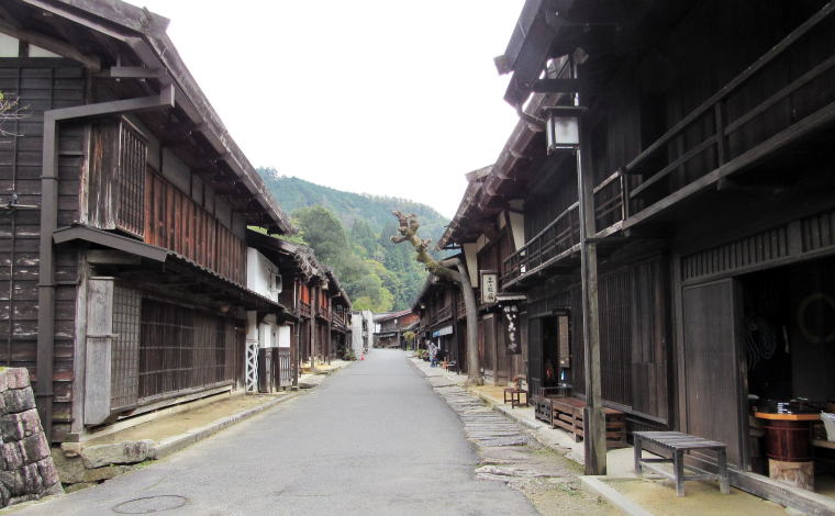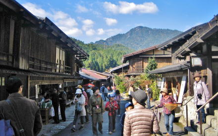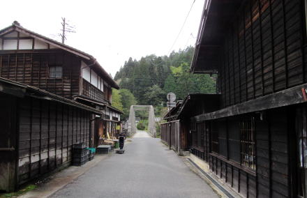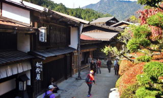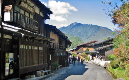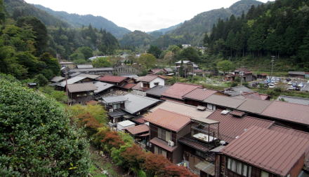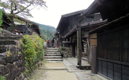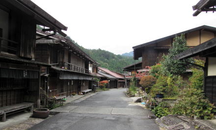 ![]() ▲光徳寺の石段参道から妻籠寺下かいわいの家並みを見おろす ![]() ▲尾又の集落。家並みの右(西)側は蘭川で河岸に発電所がある ![]() ▲尾又のT字路を西に入ると尾又橋(蘭川) ![]() ▲尾又地区では中山道の南側には山が迫っている(北からの眺め) この先の山裾、オシャゴジ様祠の脇に大平街道への追分があった。山腹を東に登っていく大平街道は伊那方面へ通じる道で、そこで中山道から分岐したという。「尾又」とは、「宿場の街外れの街道分岐点」という意味だそうだ。 ![]() ▲街道の両側に家並みがあるところから寺下地区になる ![]() ▲街道の両側に古民家が並ぶ寺下の街並み(南からの眺め) ![]() ▲晩秋の妻籠寺下地区。たくさんの観光客でにぎわう街道。 ![]() ▲寺下地区の中ほどから北側の眺め ![]() ▲桝形跡の南側の低いところを通る街道脇の家並み(北からの眺め) ![]() ▲往時の景観を復元・再現した街並み ![]() ▲桝形跡から少し下っていく石畳の小径 この部分の街道と街並みは低地にあったため、大雨が降ると、尾根の上か水がら流れ落ちてきて浸水したという。 ![]() ▲上町と寺下の境界にある桝形跡。ここには尾根が張り出していた。 ⇒上町と寺下との境界の桝形の復元図 |