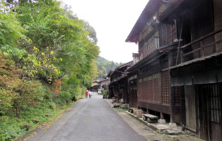 私たちは馬籠を出て馬籠峠の山道を歩き、大妻籠の集落を散策して、神明集落から大妻橋を渡って――蘭川を越えて――妻籠に入ってきました。発電所を過ぎると、妻籠宿の最南端の集落、尾又にいたります。この道が江戸時代の中山道の道筋です。妻籠宿は尾又地区から始まって、北に進むと寺下、上町、中町、下町となります。街並み景観を探索しながら、今回は尾又から寺下までを歩きます。 ◆尾又から寺下までの街並み景観◆ |
