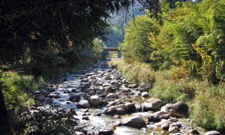 尾又のT字路を西に折れて尾又橋を渡ってみてください。橋の下を蘭川の清冽な水が流れています。流れは強く、河床には丸みを帯びた大きな石が堆積しています。橋の少し上流には発電所があって、その放水路が見えます。