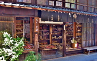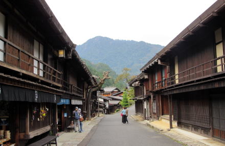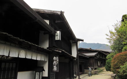 ![]() 妻籠宿の寺下の街並み景観:北側から寺下の街並みを眺める。右手(街道西脇)のアオギリの古木がランドマーク。 江戸時代最初期の宿場街は上町・中町・下町です。それが街道や街の成長とともに寺下、尾又へと南に拡大してきました。尾又や寺下は、本陣や脇本陣など宿場街の行財政機関が集まる上町以北と比べて、庶民の暮らしや小商いの場だったという印象が強い街区です。江戸時代の町家の佇まいが、昭和中期まで――経済成長の恩恵に浴することなく――そのまま残されてきたのです。 |