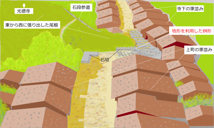 江戸時代には――松代屋など並ぶ――家並みの前の街道まで、光徳寺の背後から続く尾根が迫っていました。この尾根地形を利用して街道を西側に迂回させて、尾根下に石垣を施して桝形を構築しました。現在の舗装道路は、明治時代以降に車両を通行できるように、尾根を開削して建設したもので、昭和中期に舗装されたと見られます。尾根の切り崩しと道路整備とともに排水路・下水路を整備して、水害に対して安全な街並みに造り変えました。